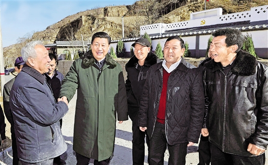 2015年2月13日,习近平总书记回到延安市延川县文安驿镇梁家河村看望村民,同他们亲切交谈。 (据新华社)