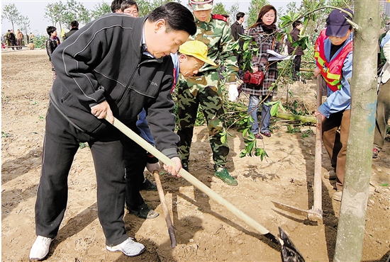 2007年2月28日,习近平在杭州钱江新城副阳台景观绿化工程现场参加义务植树活动。 本报记者 周咏南 摄