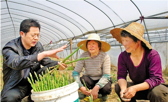 桐乡市崇德果蔬专业合作社党支部书记范建良(左)向群众传授芦笋种植技术,带领群众致富。 嘉兴市委组织部供图