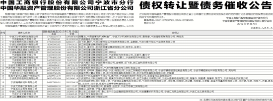 根据中国工商银行股份有限公司宁波市分行与中国华融资产管理股份有限公司浙江省分公司签订的《资产转让协议》,中国工商银行股份有限公司宁波市分行及辖属分支行所合法拥有的本公告项下资产(包括债权及担保从权利),已于2017年8月28日依法转让给中国华融资产管理股份有限公司浙江省分公司,中国工商银行股份有限公司宁波市分行特公告通知各债务人及担保人(或义务承担人),从公告之日起向中国华融资产管理股份有限公司浙江省分公司履行相关义务。
