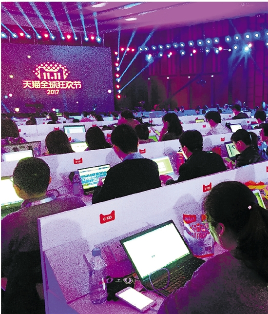 “双11”天猫全球狂欢节晚会在上海举行,媒体中心坐满了记者。 记者 徐文迪 钱丽婧 摄
