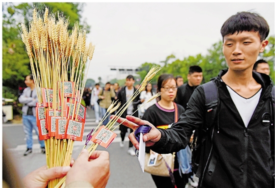 “双11”前夕,天猫杭州总部的“店小二”们摩拳擦掌,每位员工都收到一束大麦,寓意“大卖”。 记者 董旭明 摄