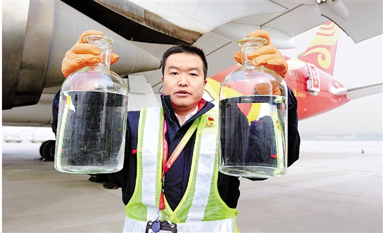 工作人员展示生物航空煤油。 拍友 吴庆明 摄