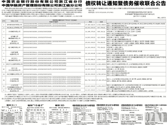 根据中国农业银行股份有限公司浙江省分行与中国华融资产管理股份有限公司浙江省分公司签署的《不良资产批量转让协议书》,中国农业银行股份有限公司浙江省分行(含各分支行)已将其对下列借款人及其担保人享有的权利(包括但不限于担保债权、违约金债权、损失赔偿权、利息债权)依法转让给中国华融资产管理股份有限公司浙江省分公司。中国农业银行股份有限公司浙江省分行与中国华融资产管理股份有限公司浙江省分公司联合公告通知各借款人及担保人以及其他相关各方。