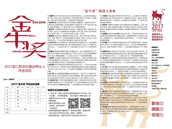 1.林国荣:杭州市余杭区径山镇小古城村党委书记。走生态旅游发展之路,全村13000余亩土地全部流转,开发经营休闲农业,村民收入不断提高。所在村获70多项荣誉,个人获余杭区优秀党员等。