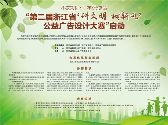 为深入学习贯彻党的十九大精神,不忘初心、牢记使命,以充满人文情怀、弘扬社会主义核心价值观和正能量的公益广告宣传为载体,倡导新时代、新风尚,形成传播主流价值、传扬新风正气、坚定文化自信的强大声势,今日起正式启动“第二届浙江省‘讲文明 树新风’公益广告设计大赛”。