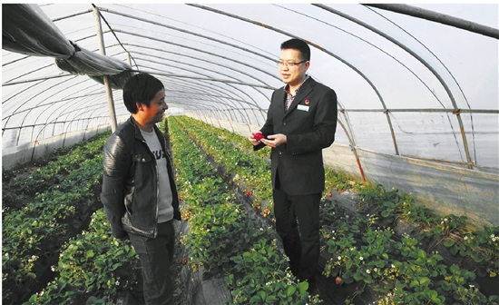 农行挂职干部在草莓种植基地了解农户经营情况。