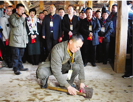 廊桥技艺传承人曾家快为文兴桥钉上最后一块桥板钉,寓意着圆桥仪式圆满完成。