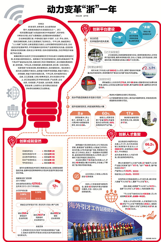 创新需要下好政策的棋、搭好要素的台、念好服务的经。创业创新已成为浙江发展的不竭动力,这得益于创新平台的搭建,得益于创新人才的集聚,得益于创新环境的打造。今年以来,杭州城西科创大走廊、之江实验室、云栖小镇等多层次、多元化创新大平台上,浙江创业创新正在书写科技创新、产业创新、企业创新、市场创新、产品创新、业态创新、管理创新的故事,以创新为主要引领和支撑的经济体系和发展模式正加速形成。