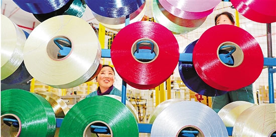 1月13日,在位于德清禹越镇的浙江汇隆新材料股份有限公司,65条生产线正开足马力生产。这是一家专业生产差别化有色涤纶长丝的企业,其产品远销中亚、南美、非洲等地。
