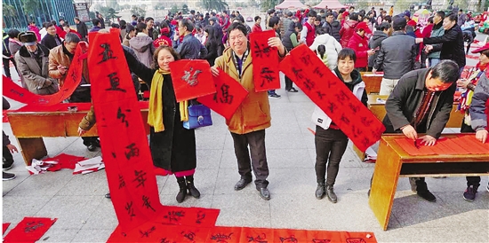 1月18日,由省文联、省书协联合主办的“奋进新时代 共享幸福春——幸福路服务小分队‘写福送春联’”活动走进磐安县盘龙广场。20余名当地书法家挥毫泼墨,现场创作、赠送春联,为群众送去新春祝福。 本报记者 杨晓轩 李翔 拍友 陈蓓蓓 摄 |