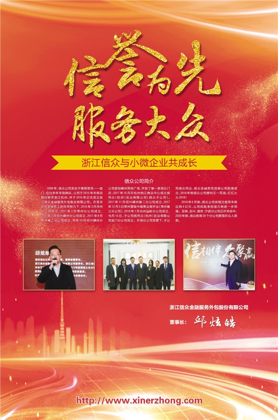 2009年,信众公司发源于美丽鹭岛—厦门,经过多年辛勤耕耘,公司于2015年末将总部迁移至浙江杭州,并于2016年正式成立浙江信众金融服务外包股份有限公司。在董事会与全体员工的共同努力下,2016年3月漳州分公司成立、2017年3月常州分公司成立、2017年7月绍兴嵊州分公司成立、2017年8月常州第二分公司成立,同年10月绍兴嵊州分公司进驻嵊州吾悦广场,开创了第一家信众门店;2017年10月在杭州悦江商业中心成立信而众(杭州)置业有限公司(信众子公司)。2017年11月绍兴嵊州第二分公司成立,2017年12月5日常州晋陵中路营业部开业(常州第三分公司),2018年1月台州温岭分公司成立,当月15日,子公司信而众(杭州)置业有限公司厦门分公司成立。在信众公司发展下,子公司信众药业、信众非融资性担保公司陆续成立,2018年将信众公司推向又一高潮,红红火火2018!