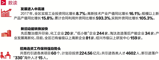 先后整治提升印染、化工企业20家、“低小散”企业244家,淘汰改造落后产能企业34家;产业发展高新化,目前,全区已有省级以上高新企业81家,绍兴市级以上研发中心159家。
