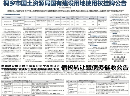 根据中国建设银行股份有限公司宁波市分行与中国华融资产管理股份有限公司浙江省分公司签订的《资产转让合同》,中国建设银行股份有限公司宁波市分行及辖属分支行所合法拥有的本公告项下资产(包括债权及担保从权利),已于2017年12月15日依法转让给中国华融资产管理股份有限公司浙江省分公司,中国建设银行股份有限公司宁波市分行特公告通知各债务人及担保人(或义务承担人),从公告之日起向中国华融资产管理股份有限公司浙江省分公司履行相关义务。