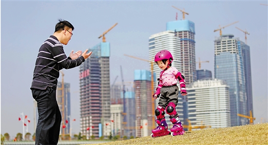 2月8日,公园里一位父亲正在教女儿练习轮滑。公园的背景是正在崛起的深圳前海深港现代服务业合作区。