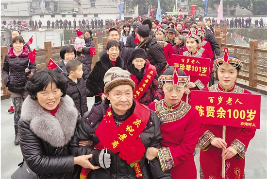 2月10日,景宁畲族自治县鹤溪街道一座连接鹤溪两岸的小桥——景商桥复建完工,人们请来两位百岁老人和儿童为新桥开通剪彩、踏新。老人和儿童为新桥踏新源自当地古老习俗,既倡导敬老扶幼,又寓意代代相传。