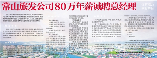 浙江常山旅游发展投资运营有限公司,简称常山旅发公司,主要从事旅游项目投资开发建设、旅游景区运营管理、旅游相关经营服务等业务,公司注册资本金1.5亿元。为推进常山旅游事业发展,现向社会市场化选聘旅发公司总经理1名。