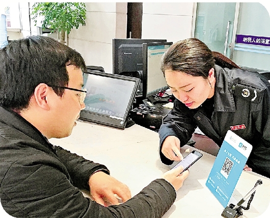 工作人员在向纳税人演示,如何通过支付宝网上办税。 沈吟 摄