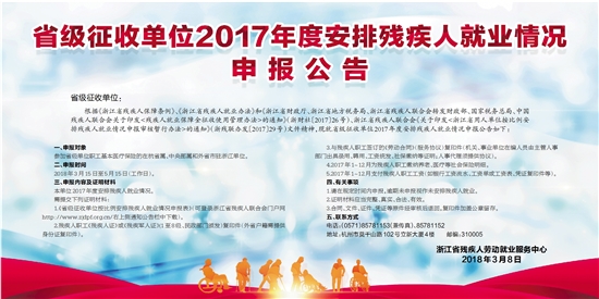 根据《浙江省残疾人保障条例》、《浙江省残疾人就业办法》和《浙江省财政厅、浙江省地方税务局、浙江省残疾人联合会转发财政部、国家税务总局、中国残疾人联合会关于印发<残疾人就业保障金征收使用管理办法>的通知》(浙财社〔2017〕26号)、浙江省残疾人联合会《关于印发<浙江省用人单位按比例安排残疾人就业情况申报审核暂行办法>的通知》(浙残联办发〔2017〕29号)文件精神,现就省级征收单位2017年度安排残疾人就业情况申报公告如下: