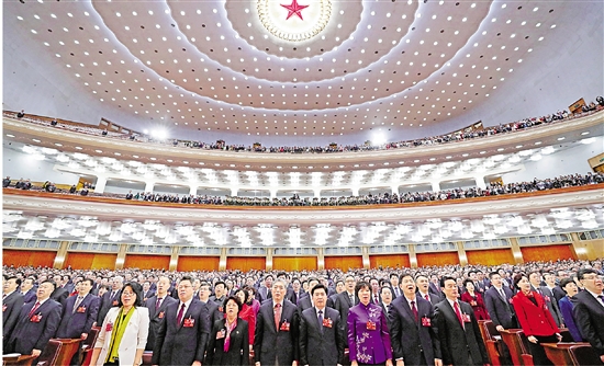 3月15日,中国人民政治协商会议第十三届全国委员会第一次会议在北京人民大会堂举行闭幕会。这是委员们高唱国歌。 新华社记者 庞兴雷 摄