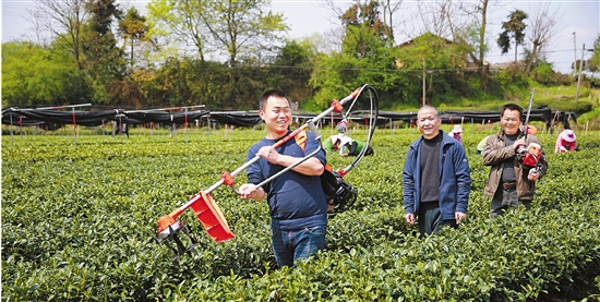 松阳县新兴镇外石塘村茶叶种植大户叶洪清(左)收到县农业局农机管理站送来的生产器械,开心地走向茶园。