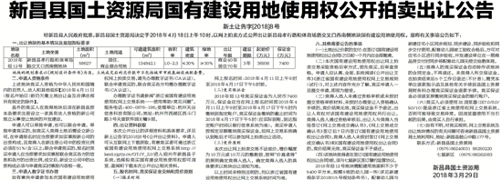 经新昌县人民政府批准,新昌县国土资源局决定于2018年4月18日上午10时,以网上拍卖方式公开出让新昌县孝行路和体育场路交叉口西南侧地块国有建设用地使用权。现将有关事项公告如下: