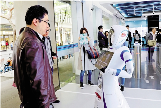 | 近日,中国建设银行在上海九江路开出国内首家无人银行。由机器人迎宾的大堂取号流程到常规银行90%的现金及非现金业务,都可以在无人银行完成,用户首次使用时将手机号、银行卡和人脸识别信息绑定,以后不带银行卡也可以实现刷脸取款功能。图为一位市民在无人银行入口处向迎宾机器人说明需要办理的业务种类。 新华社记者 方喆 摄 |