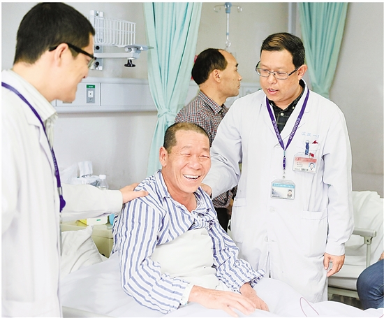 郑伟明医生(右)正在病房内查看病人。 本报记者 蒋超 摄