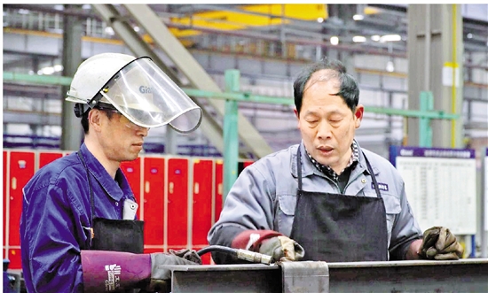俞天明(右)正在车间向徒弟传授技术。