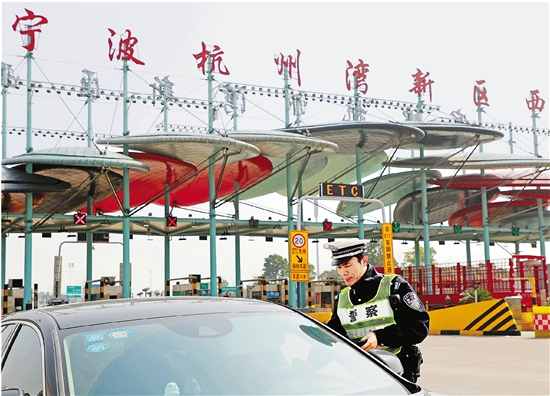 在跨海大桥收费站,祁均焕在劝导开车打手机的司机。