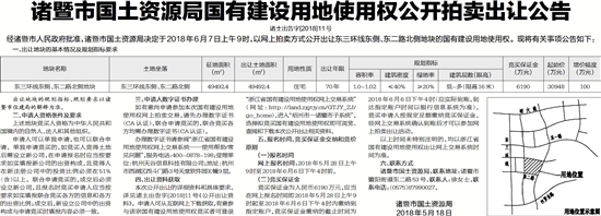 经诸暨市人民政府批准,诸暨市国土资源局决定于2018年6月7日上午9时,以网上拍卖方式公开出让东三环线东侧、东二路北侧地块的国有建设用地使用权。现将有关事项公告如下:
