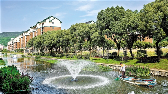 日前,一名河道保洁员在舟山市定海区金塘镇沥港横河保洁清污。一年多来,金塘镇多举措对辖区河道进行治理,河面水生植物生机勃勃,河道水质明显改善。这也是浙江各地持续推进生态环境治理的生动缩影。 拍友 姚峰 摄