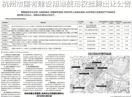 五、竞买申请:参加挂牌竞买的竞买申请人可在2018年6月26日9时至2018年7月5日17时登录浙江省土地使用权网上交易系统(http://land.zjgtjy.cn/GTJY_ZJ/go_home)进行报名。竞买申请人须按照挂牌须知要求办理数字证书并足额交纳竞买保证金,符合竞买要求方可参加网上挂牌出让活动。
