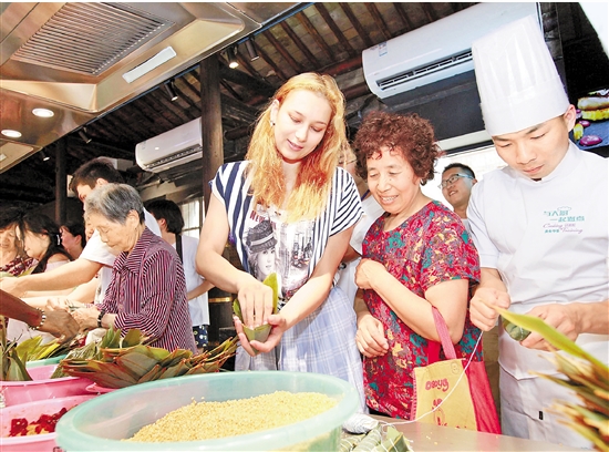 6月13日,在湖州市小西街历史文化街区,来自俄罗斯、乍得、津巴布韦等国的留学生,饶有兴趣地与当地居民一起包粽子、做绿豆糕,感受中国传统节日端午节的文化魅力。