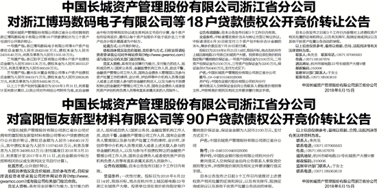 中国长城资产管理股份有限公司浙江省分公司对拥有的浙江博玛数码电子有限公司等18户贷款债权分为三个资产包进行公开竞价转让:
