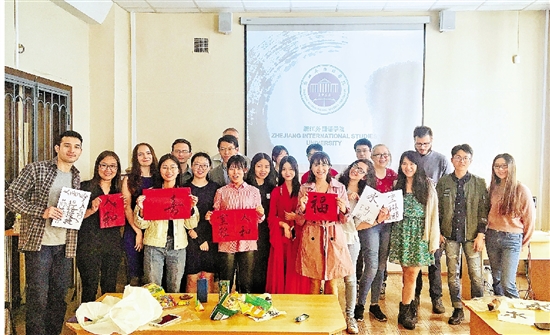 近日,浙江外国语学院学生走出国门,在海外讲述中国故事,传播中国文化,深受欢迎。图为安高伟等10名西语学院俄语专业学生在俄罗斯托木斯克理工大学为来自俄罗斯、韩国、日本、意大利、法国和哈萨克斯坦等国的大学生展示并带领他们一起体验中国传统文化。他们介绍了汉字的起源、发展和演变,还手把手教外国大学生学用毛笔写自己的名字,新颖的活动内容与形式激发起外国师生的强烈兴趣。 张伟慷