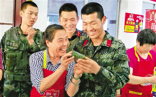 6月15日,市兰江街道兰花社区的工作人员和志愿者们来到武警兰溪中队,和官兵们一起包粽子、迎端午,共叙军民鱼水深情。