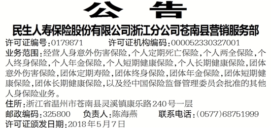 民生人寿保险股份有限公司浙江分公司苍南县营销服务部