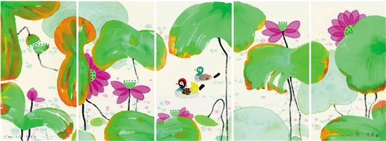 家乡的西湖,在画家陈家泠的笔下出现过无数次。在陈家泠看来,西湖就像东方美女,温柔而含蓄。他画曲院风荷,荷花红而亮丽,但绝不艳俗,配以绿叶,高洁飘逸,充满了东方神韵。 (作品现收藏于国家博物馆)