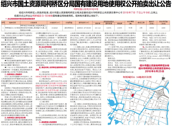 七、本公告在《浙江日报》、《绍兴日报》、《柯桥日报》、绍兴市电视台、绍兴市柯桥区广播电视总台、浙江省国有建设用地使用权网上交易系统(http://tdjy.zjdlr.gov.cn/GTJY_ZJ/go_home)、绍兴市柯桥区公共资源交易网(www.sxxztb.gov.cn)等媒体发布。