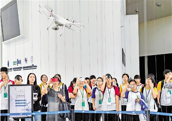 6月25日,香港学生在位于深圳的大疆创新旗舰店参观。当日,“改革开放四十年——探索内地发展成就之旅”正式启动,首批来自香港的132名中学师生分两批赴深圳和惠州,参观大疆、比亚迪等深圳科技企业,以及惠州南旋集团等港资企业。 新华社记者 毛思倩 摄 |