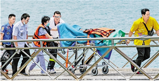 7月6日,在泰国普吉岛差隆码头,救援人员转移一名伤者。 新华社发