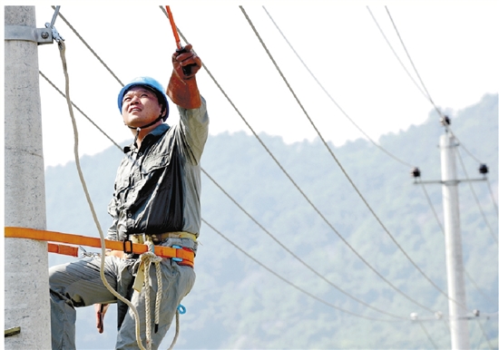 国网乐清市供电公司工作人员检修柳市镇供电线路。
