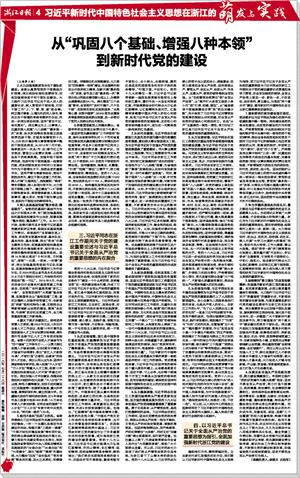 1.鲜明提出“巩固八个基础、增强八种本领,加强党对经济社会发展全面领导”。加强党的长期执政能力建设,是把我们党锻造成为中国特色社会主义坚强领导核心的现实要求。党的十六大提出了加强党的执政能力建设的战略任务,党的十六届四中全会又对此进行了专门部署。在这个重大问题上,习近平同志有着深入系统的思考。他指出:“改革开放以来,我省经济社会发展之所以能取得巨大成就,最根本的就是围绕‘中心’,强化‘核心’,充分发挥党的领导核心作用。”省委十一届四次全会在部署实施“八八战略”的同时,作出进一步加强和改进党的建设的决定。在2004年10月召开的省委十一届七次全会上,习近平同志进一步指出,党的执政能力建设有其自身的内涵和要求,但最终还是要体现在经济、政治、文化、社会的发展上,体现在党的各项建设上。这次全会审议通过切实加强党的执政能力建设的意见,就巩固党执政的八个基础、增强党执政的八种本领作出重大部署:即致力于巩固党执政的思想基础,加强理论武装和党对意识形态工作的领导,不断增强用发展着的马克思主义指导新实践的本领;致力于巩固党执政的经济基础,全面推进经济强省建设,不断增强驾驭社会主义市场经济的本领;致力于巩固党执政的政治基础,全面推进法治社会建设,不断增强发展社会主义民主政治的本领;致力于巩固党执政的文化基础,全面推进文化大省建设,不断增强建设社会主义先进文化的本领;致力于巩固党执政的社会基础,全面推进平安浙江建设,不断增强构建社会主义和谐社会的本领;致力于巩固党执政的体制基础,健全和完善党的领导制度和领导方式,不断增强地方党委总揽全局、协调各方的本领;致力于巩固党执政的组织基础,加强干部队伍建设和基层组织建设,不断增强自身素质和团结带领广大群众干事业的本领;致力于巩固党执政的群众基础,密切党同人民群众的血肉联系,不断增强拒腐防变和抵御风险的本领。这一重大部署,着眼伟大工程与伟大事业的内在联系,切准关键点和着力点,为浙江党的建设奠定了重要基石。习近平同志十分注重强化党总揽全局、协调各方的领导核心作用,推动健全完善了“一个核心”“三个党组”的领导体制和工作机制,有力强化了党委把方向、谋全局、议大事、管干部、抓人才的职能,从体制机制上保证了党委领导核心作用的充分发挥,推动党的全面领导落实落地。