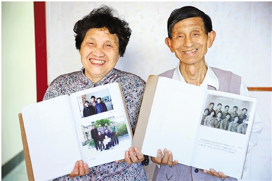 鲍利军和妻子何仕雅展示家庭档案里的相册。