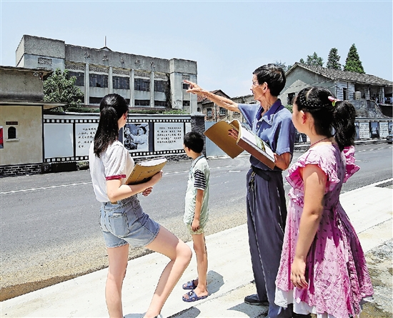 鲍利军在诸暨江藻电影院旧址回忆建设电影院时的情景。