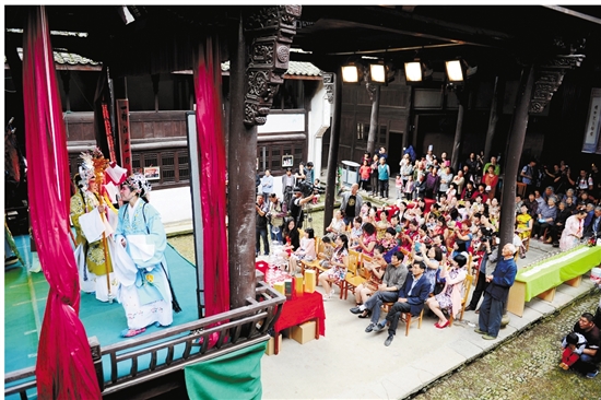 十里坪村文化礼堂,村民正在自编自演戏曲活动