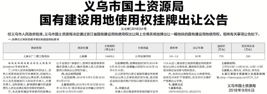 经义乌市人民政府批准,义乌市国土资源局决定通过浙江省国有建设用地使用权出让网上交易系统挂牌出让一幅地块的国有建设用地使用权。现将有关事项公告如下: