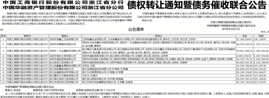 根据中国工商银行股份有限公司浙江省分行与中国华融资产管理股份有限公司浙江省分公司签署的《资产转让协议》,中国工商银行股份有限公司浙江省分行(含各分支行)已将其对下列债务人及其担保人享有的主债权及担保合同项下的全部权利依法转让给中国华融资产管理股份有限公司浙江省分公司。中国工商银行股份有限公司浙江省分行与中国华融资产管理股份有限公司浙江省分公司联合公告通知各债务人及担保人以及其他相关各方。