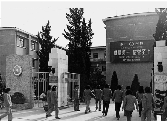 1984年,步鑫生在衬衫总厂门口迎接工人上班。